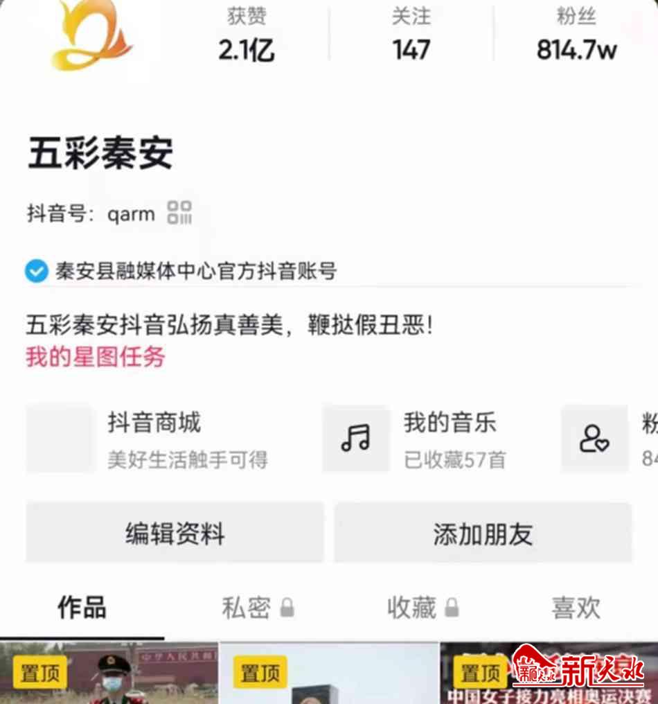 截至目前,“五彩秦安”抖音号共发布短视频17000余条,获点赞 2.1亿,粉丝数814.7万。创单条浏览量最高达9619.1万、单条点赞最高达296.3万、日增粉丝量最高达6.8万、单条浏览量上千万作品达到1000多条的良好记录。