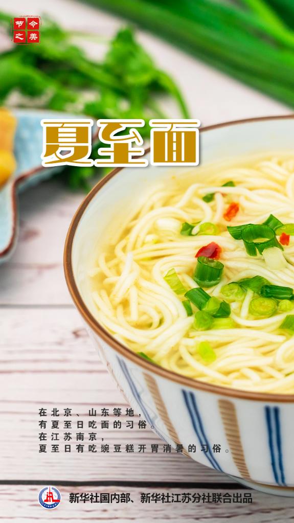 在北京、山东等地,有夏至日吃面的习俗。古人选定这一天吃面,是希望把白天吃“短”。在江苏南京,人们选择在夏至日这天做豌豆糕,也称“夏至糕”,既开胃消暑,也寓意节节升高、平安健康。
