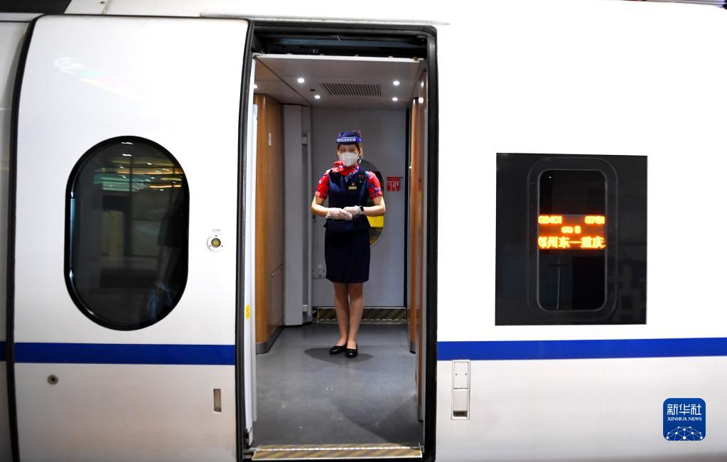 6月20日,郑渝高铁郑州首发G3401次列车乘务员在车厢内等候旅客。