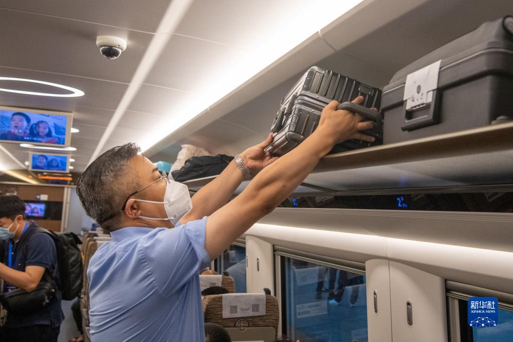 6月20日,搭乘郑渝高铁重庆首发G52次列车的旅客在车厢内整理行李。