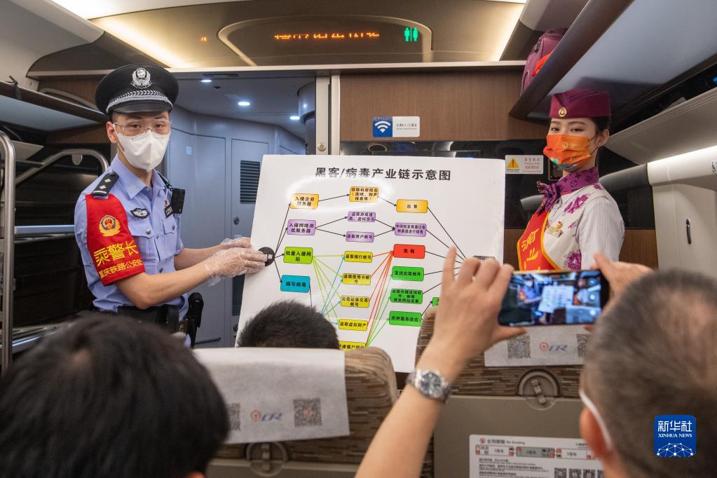 6月20日,在郑渝高铁重庆首发G52次列车上,铁路公安和乘务员在宣讲安全知识。