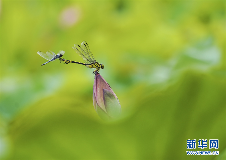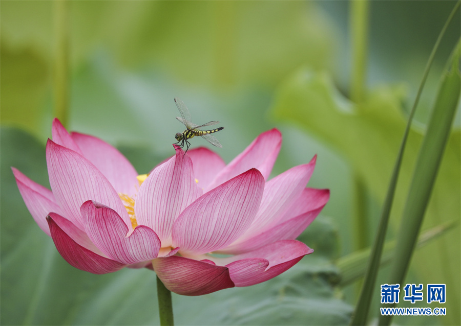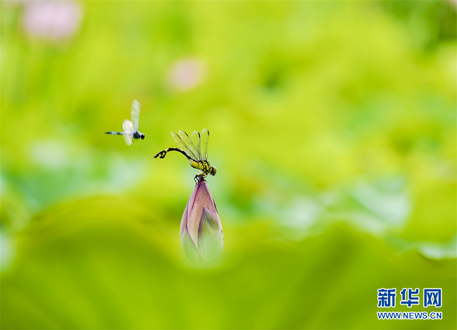 6月20日,安徽省芜湖市陶辛水韵万亩荷花次第盛开,一只蜻蜓停栖在荷花上。