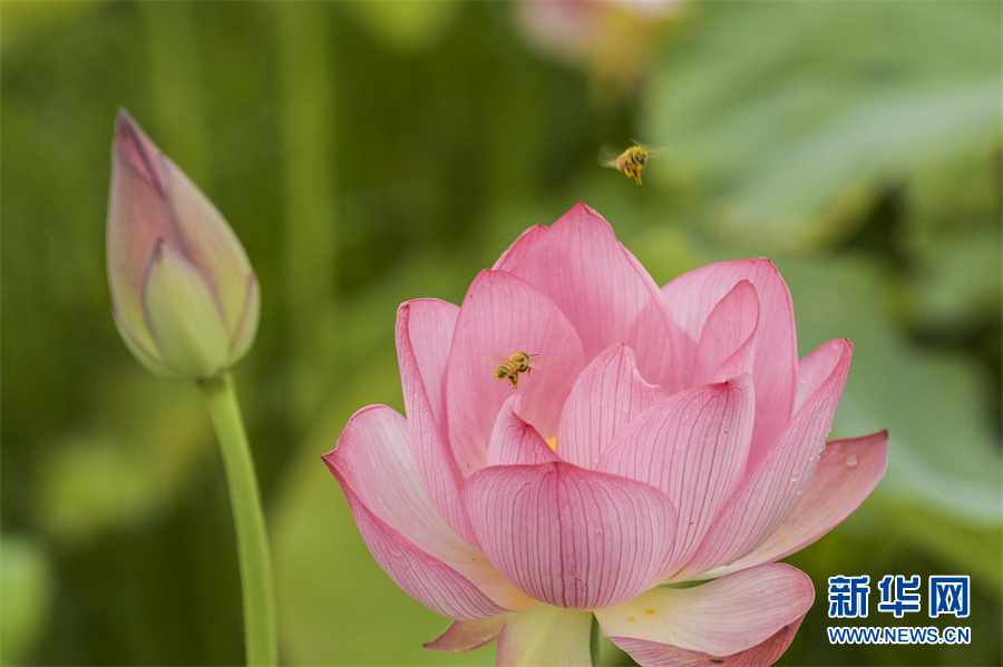 6月20日,安徽省芜湖市陶辛水韵万亩荷花次第盛开,两只蜜蜂在荷花间飞舞。