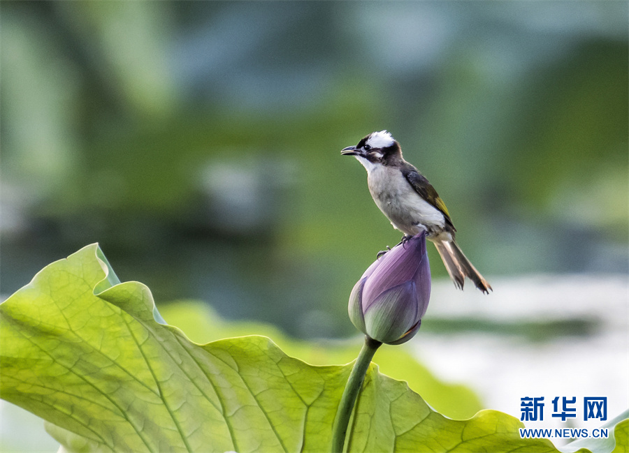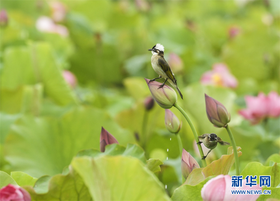6月20日,安徽省芜湖市陶辛水韵万亩荷花次第盛开,一只小鸟停栖在荷花上。