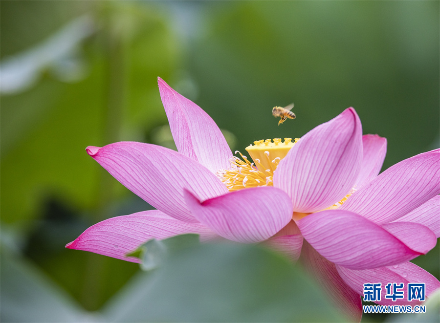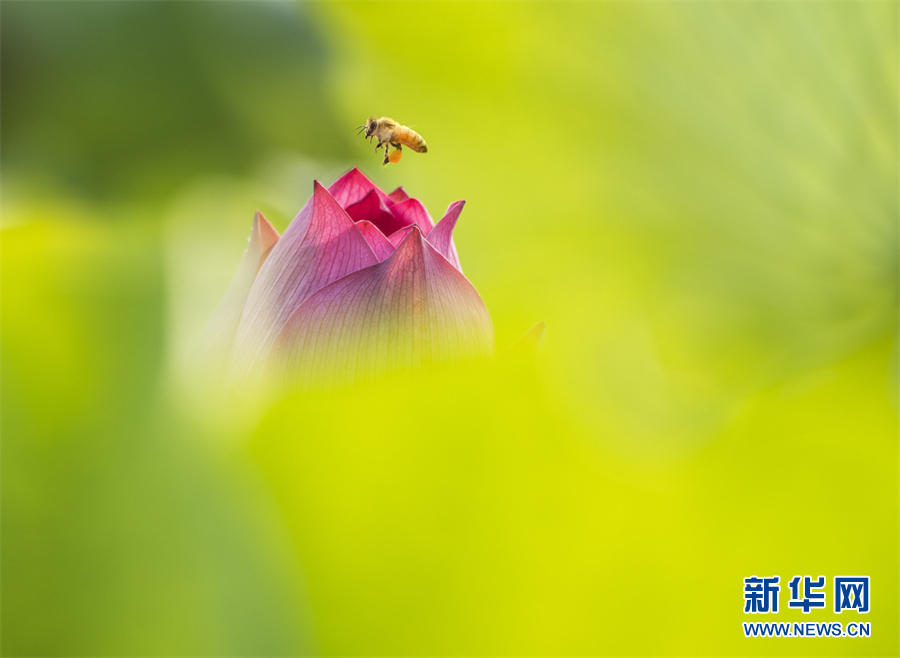 6月20日,安徽省芜湖市陶辛水韵万亩荷花次第盛开,一只蜜蜂在荷花间飞舞。