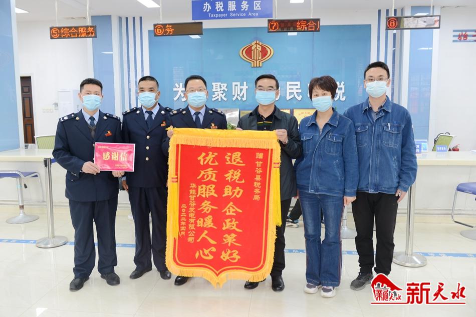 为感谢县税务局在华能甘谷发电有限公司复工复产过程中的雪中送炭,收到退款资金后不久,该公司一行人来到县税务局,将一面锦旗和一封感谢信送到了税务局主要负责人的手中,连声感谢。
