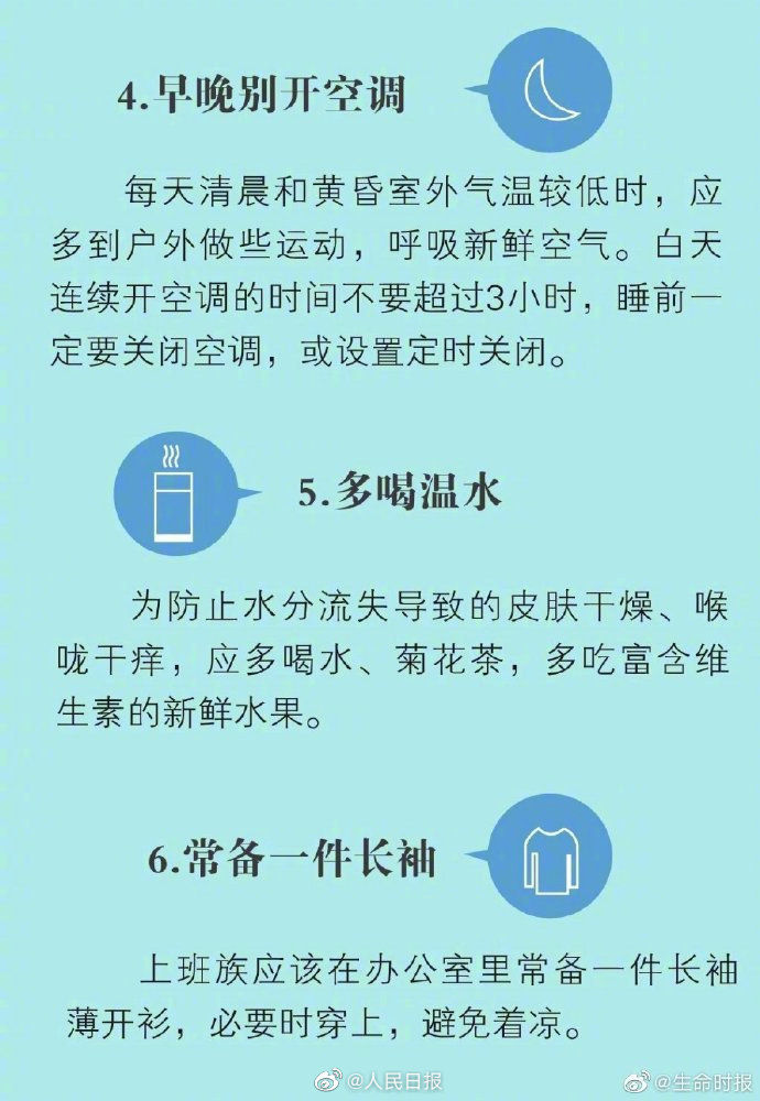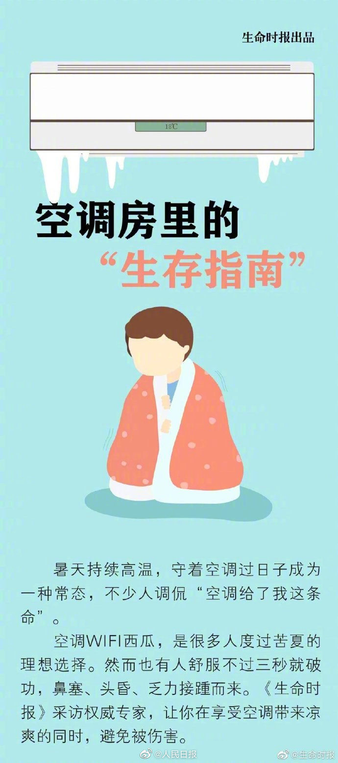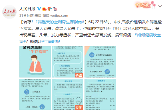 【转存!高温天的空调房生存指南】6月22日6时,中央气象台继续发布高温橙色预警。夏天到来,高温天又来了,你家的空调打开了吗?部分人吹空调后,会出现鼻塞、头晕、乏力等症状,严重者还会感冒发烧、肩颈疼痛…如何健康吹空调?