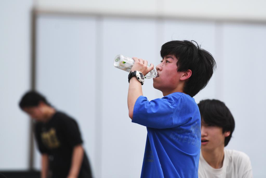 6月21日,在河南省郑州市金水区花园路,男孩在运动后补水。 新华社记者 张浩然 摄