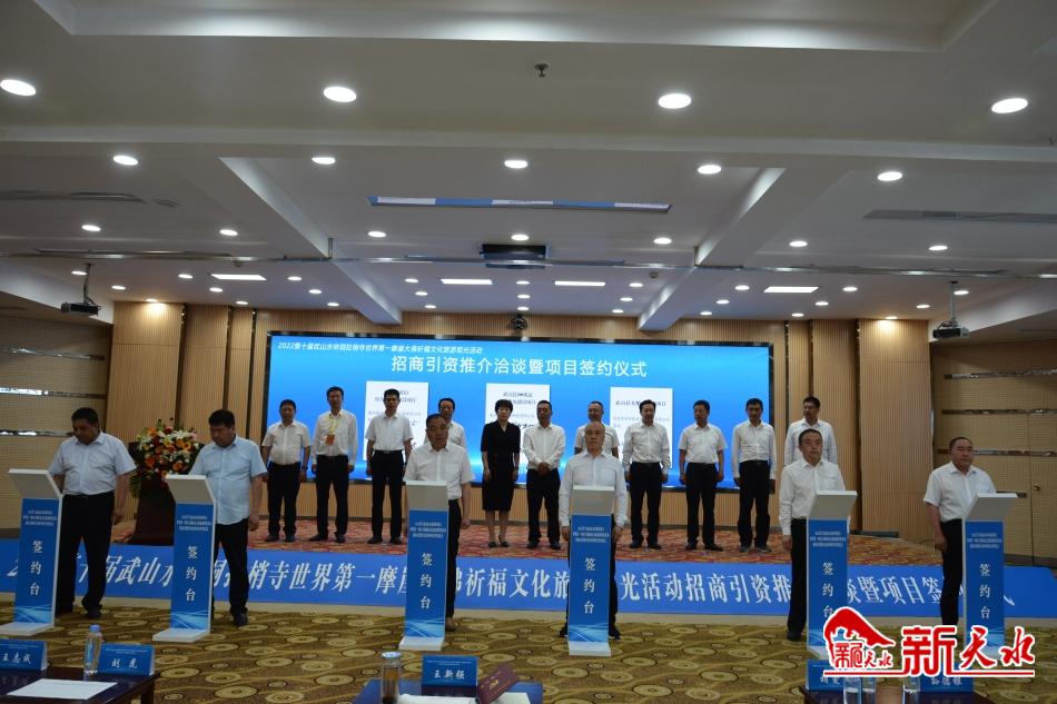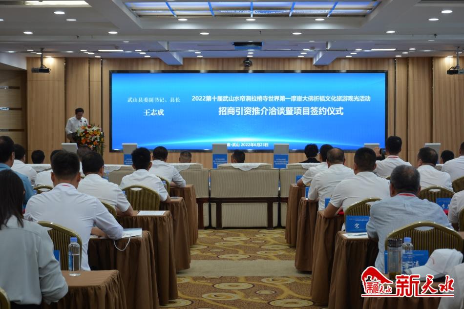 新天水讯【记者张彬霞】6月23日,武山县举行2022第十届武山水帘洞拉梢寺世界第一摩崖大佛祈福文化旅游观光活动招商引资推介暨签约仪式。签约仪式上,武山县与来自北京、天津、广州、江苏、湖北等地的14家企业签约招商项目14项,签约资金45.5亿元。