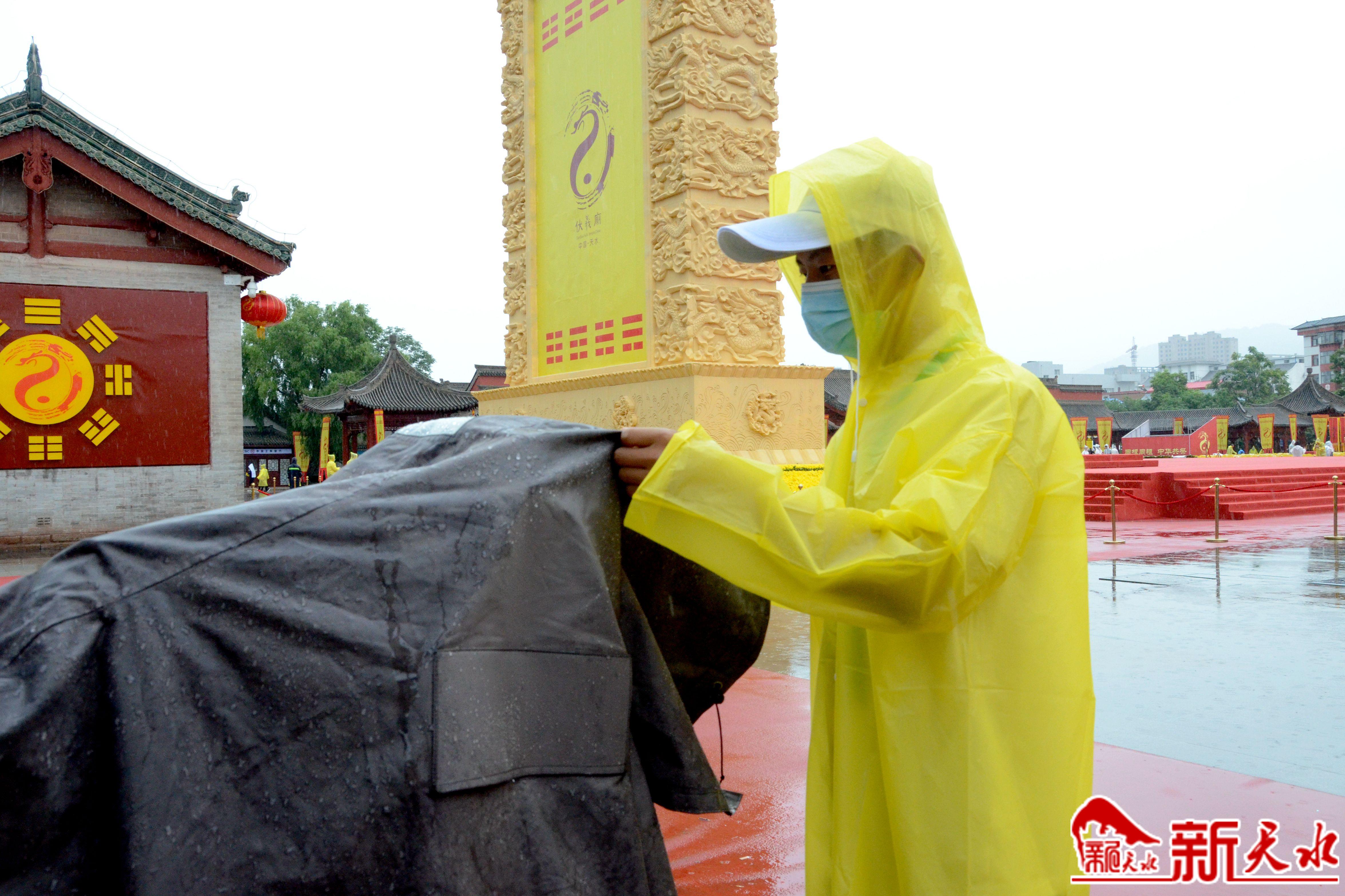 6月22日一大早,天空下起了淋淋沥沥的小雨,但参加公祭伏羲大典的志愿者们早早就来到了指定地点并有序集合,大学生志愿者雷旭青便是其中之一。