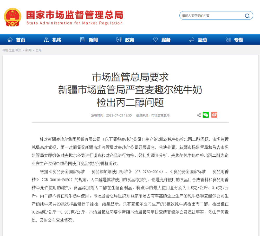 针对新疆麦趣尔集团股份有限公司(以下简称麦趣尔公司)生产的2批次纯牛奶检出丙二醇问题,市场监管总局高度重视,第一时间督促新疆市场监管局对麦趣尔公司开展调查,依法处置。新疆市场监管局和昌吉市场监管局立即组织对麦趣尔公司进行调查和对产品进行抽检,经初步调查分析,麦趣尔纯牛奶中检出丙二醇为企业在生产过程中超范围使用食品添加剂香精所致。