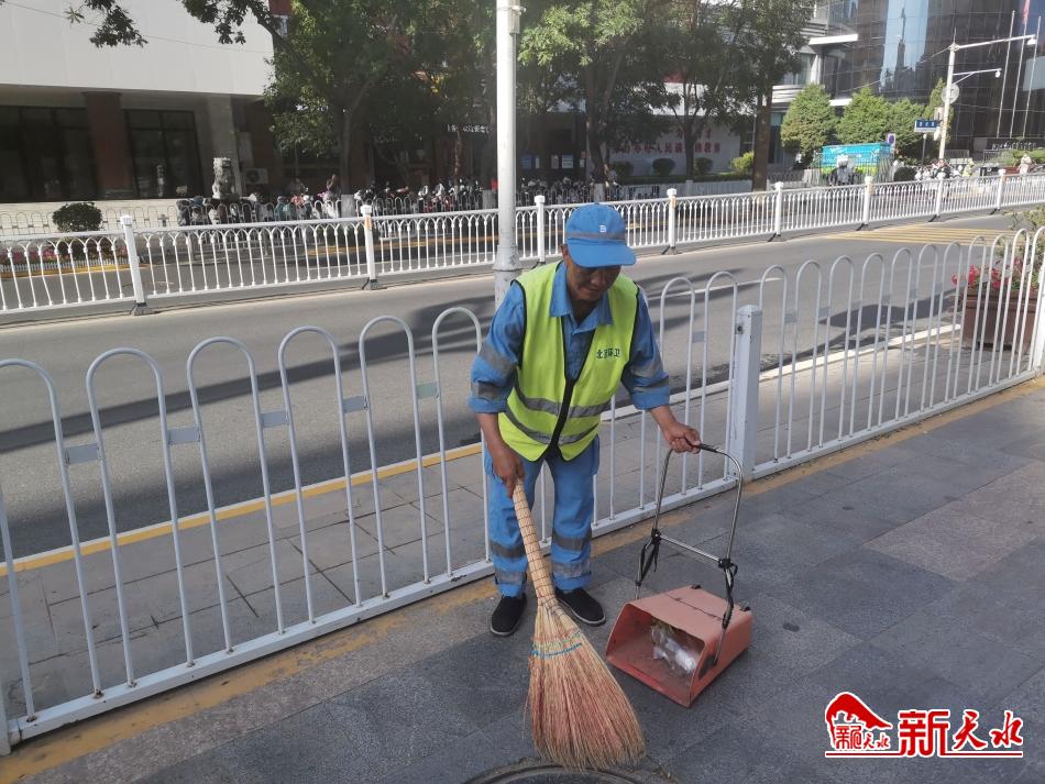夏天的早晨,太阳出来得特别早,透过树叶在地面上留下斑驳的影子,走在大街上让人感受到一阵阵热浪。7月5日上午10时,室外气温已达30℃以上,记者在秦州区建设路见到徐金全时,他正一刻不停地清扫着马路,豆大的汗珠顺着脸颊滑落。虽然天气炎热,但他依然帽子口罩手套、长袖长裤加身,包裹得严严实实。