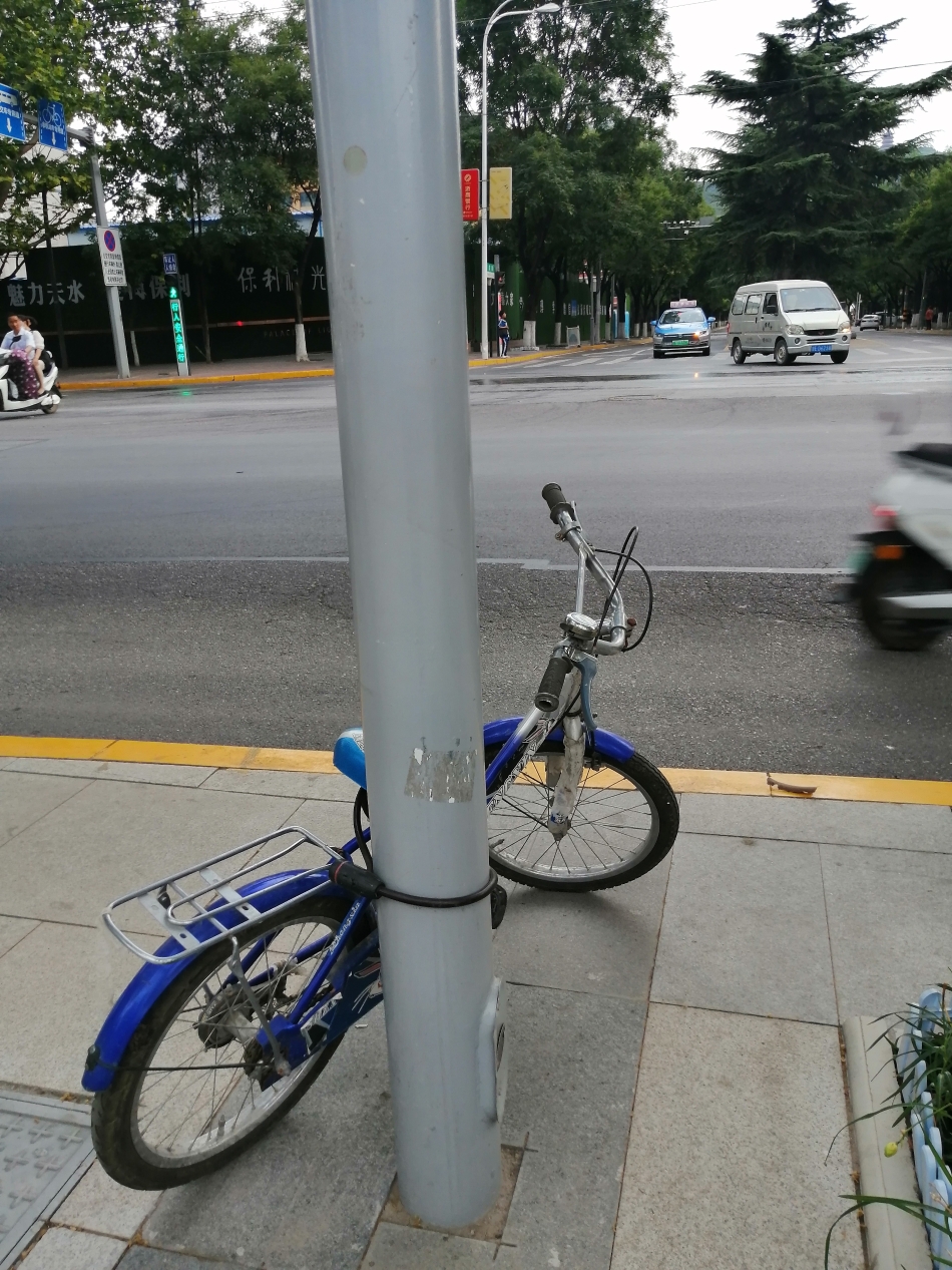 7月4日傍晚,一辆自行车被铁链锁在秦州区岷山路弘文园大门口的交通设施立柱上,十分扎眼。