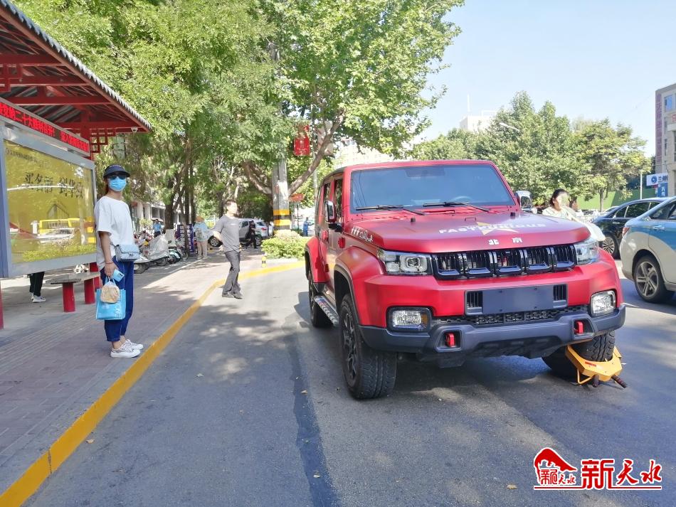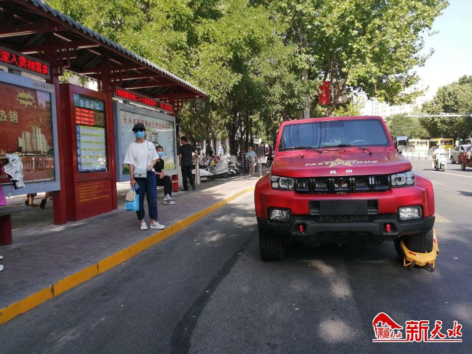 7月5日上午8时,在秦州区岷山路公交车安居南站候车的市民发现,公交港湾处一辆较大型的红色越野车长时间占道停车,被相关部门用锁车器锁住车轮,并贴上了温馨提示。