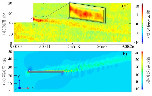 为进一步测试雷达观测性能和环境适应性,科研团队利用该雷达在高铁站实地测量了高速列车尾流中的风场结构。雷达在无人值守下连续稳定工作超过100小时,获得了3米和0.1秒高时空分辨率下的350km/h的高铁尾流连续观测。