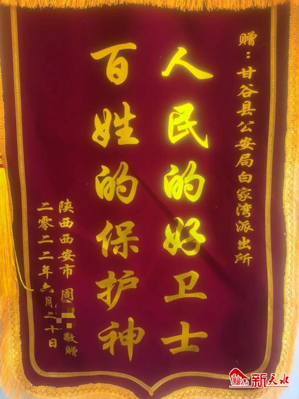 新天水讯【记者蔚军平】近日,陕西省西安市的周先生通过邮寄方式,将一面写有“人民的好卫士,百姓的保护神”的锦旗寄到甘谷县公安局白家湾派出所,以此来表达他们全家对民警及时救助自己儿子的感恩之情。