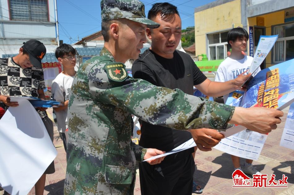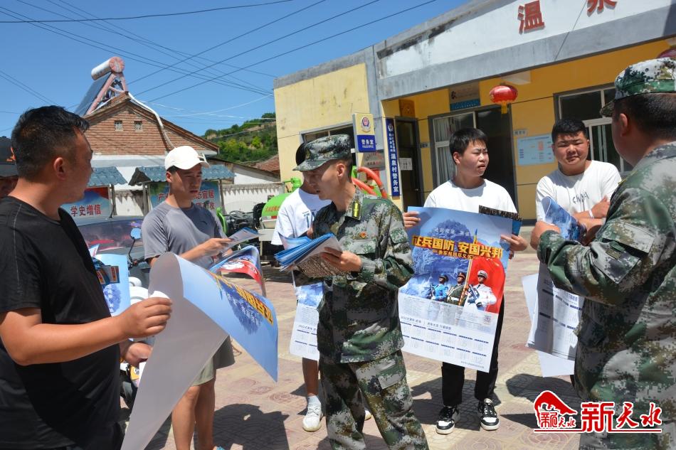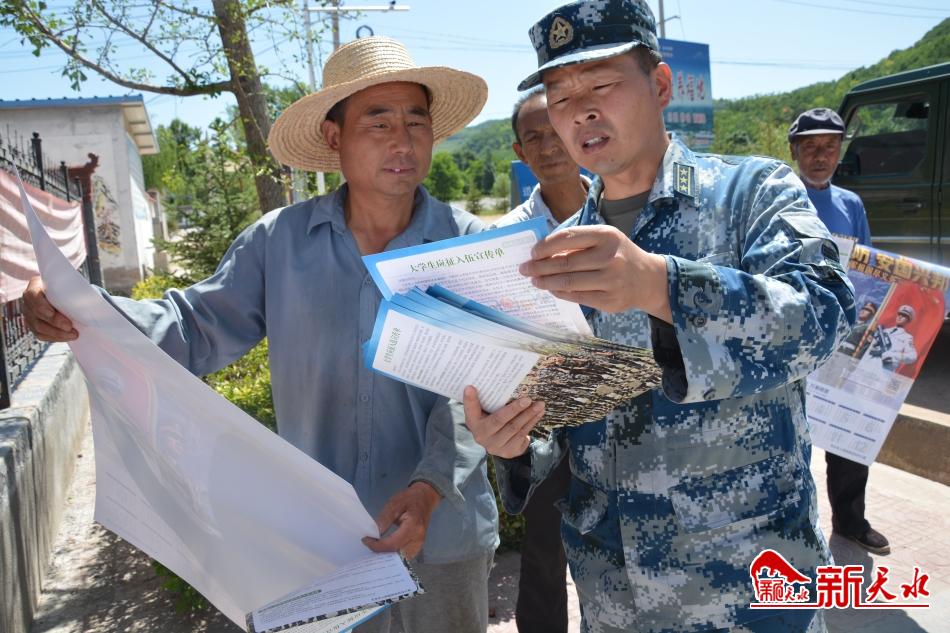 连日来,清水县征兵办工作人员冒着高温酷暑,先后深入永清、白沙、山门等各个乡镇的村组,向广大村民群众发放《征兵国防 安国兴邦》《优秀青年立志从军 热血男儿精忠报国》宣传画、《2022征兵手册》等宣传资料,宣传介绍下半年征兵入伍时间、征兵条件等征兵政策。尤其针对大学毕业生及其家属,工作人员深入讲解大学生入伍优惠政策、十大好处、国家资助办法等内容,发放《大学生应征入伍宣传单》,为2022年下半年征兵工作营造良好的宣传氛围,打下了坚实的基础。新天水记者王莹 摄
