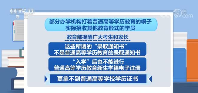 一些不法分子或中介故意混淆普通高等学历教育与其他教育形式之间的区别,以自考助学班、网络教育班、合作办学等入学通知书蒙骗考生及家长。部分办学机构打着普通高等学历教育的幌子,实际招收其他教育形式的学员。教育部提醒广大考生及家长,这些所谓的“录取通知书”不是普通高等学历教育的录取通知书,“入学”后也不能进行普通高等学历教育新生学籍电子注册,更拿不到普通高等学校学历证书。普通高等学历教育学生均须通过高考招录。