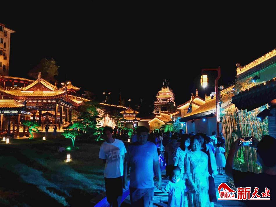 夜晚的天水古城,灯火璀璨、古风浓郁。休闲娱乐的市民漫步其中,仿佛穿越古代,置身仙境。