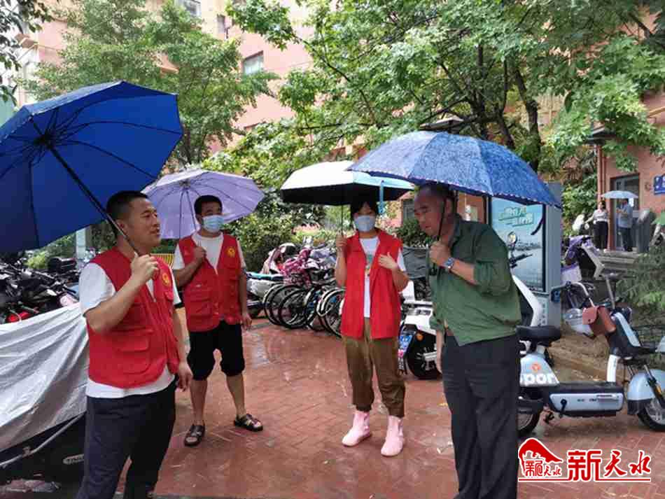 新天水讯 7月11日下午,大雨来袭。罗玉二社区工作人员冒雨走上街头,排查辖区安全隐患,筑牢防汛安全堤,为居民撑起“安全伞”。