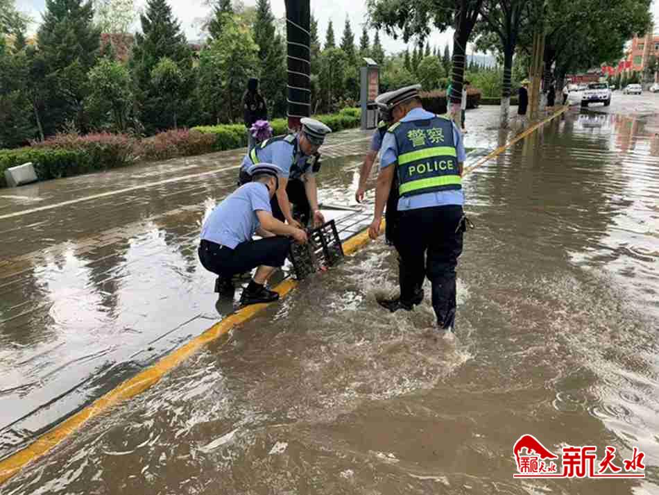 强降雨发生后,秦安县城区的道路由于地势低洼,下水道入水口被雨水冲刷而来的泥土、树叶等杂物堵塞,瞬间导致道路积水严重,过往车辆难以通行。面对这种情况,民警快速反应,纷纷卷起裤腿,徒手清理杂物,疏通堵塞的下水道口,全力疏导保交通畅通。