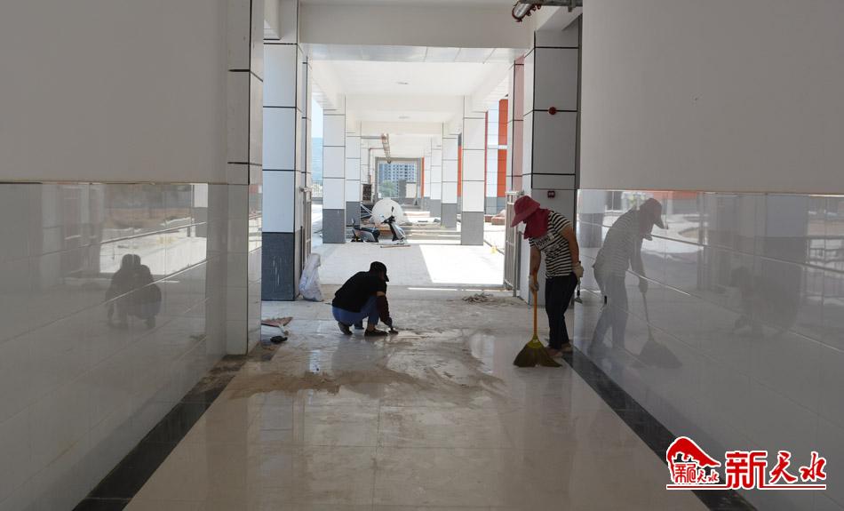 7月8日,记者来到太京镇刘家庄小学施工现场,只见南北方向的一座连廊将教学楼、行政楼三栋建筑并排连接起来,红白两色相间的建筑外墙看上去格外醒目。在过道和楼梯间,可以看到施工人员正在进行弱电的收尾施工和地面的卫生清扫。记者走进其中一间教室,通透的大玻璃窗,视野开阔,在阳光的照射下,整个教室显得宽敞明亮。在南侧有一栋独立的高3层的建筑,那是学校的食堂,保洁人员正在擦洗瓷砖墙面、地面以及窗户玻璃。在操场上,施工人员顶着炎炎烈日,正在抓紧进行操场排水、看台等施工。