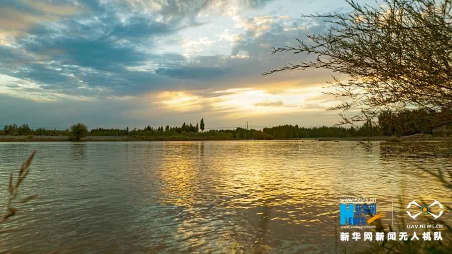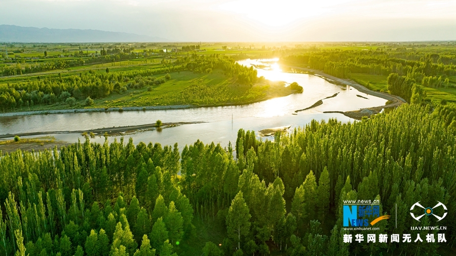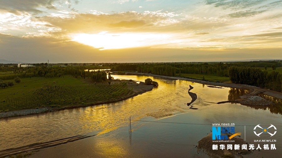 这是7月17日在甘肃省张掖市航拍的黑河晚照。新华网发 (成林 摄)