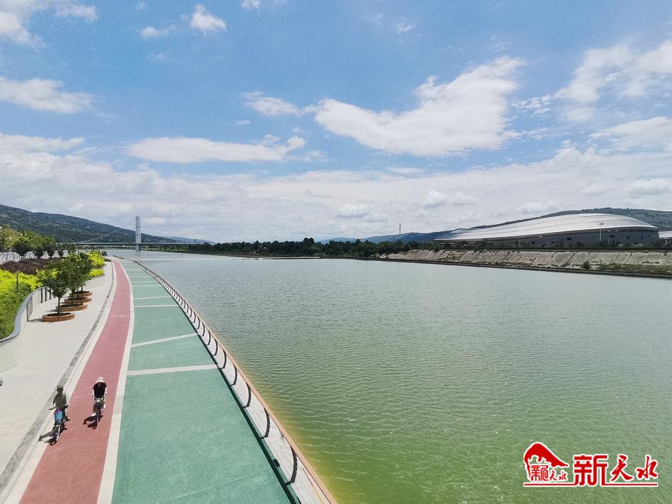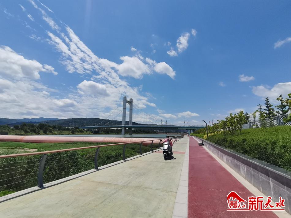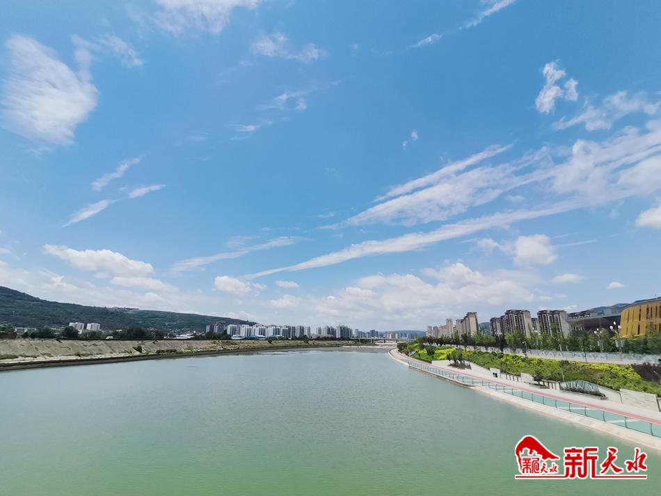 7月19日,几场降雨过后的古城天水,天蓝水碧,白云悠悠,空气清新,从藉河风情线远眺,蓝天为幕,水天一色,“天水蓝”惹人醉。