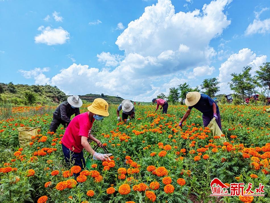 新天水讯 7月19日,记者在武山县榆盘镇徐黄村看到,一朵朵金黄色的万寿菊竞相绽放,引来蜂蝶在花丛翩翩起舞,村民们穿梭在花海间,有的在采摘,有的在装袋,还有的在装车,田间地头一派繁忙景象。