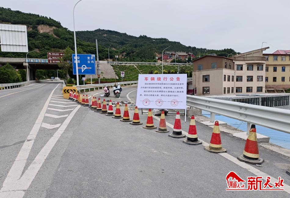 新天水讯【记者蔚军平】7月20日,记者从天水市公安局交警支队卦台山大队了解到,因近期降雨导致国道G310线秦州至麦积方向匝道路面裂缝、路基坍塌、交通中断。通往麦积方向车辆需经七里墩进入秦麦高速,或经由羲皇大道、成纪大道绕行。