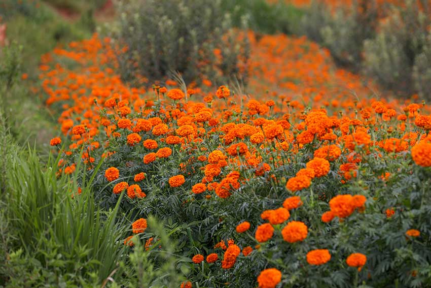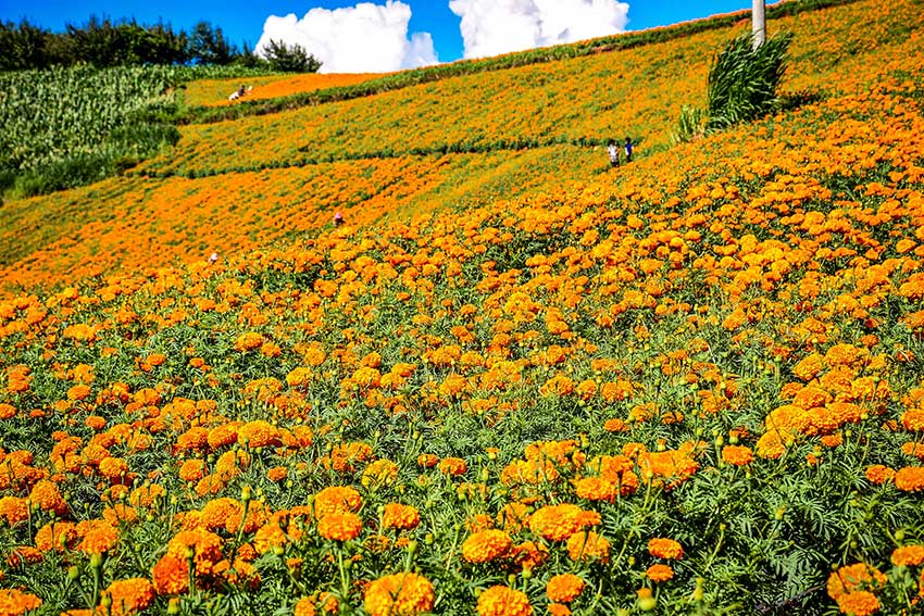 ▲时下,走进灵泉街道三台铺村委会,金灿灿的万寿菊竞相绽放。开远市融媒体中心供图