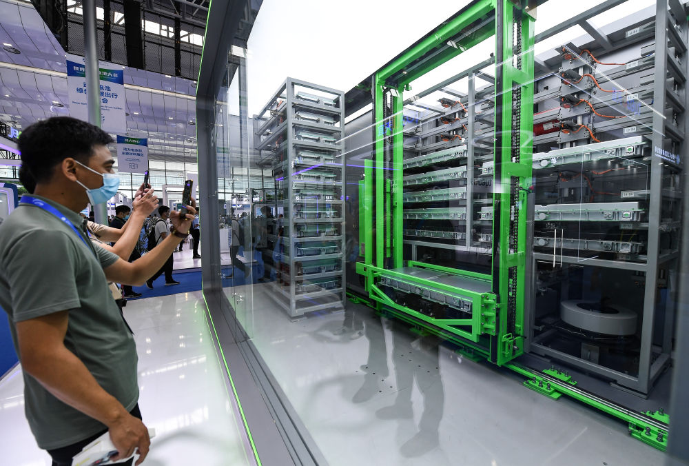 7月21日,在2022世界动力电池大会动力电池绿色低碳出行展览会上,观众在用手机录制电动汽车换电过程。新华社记者 王曦 摄