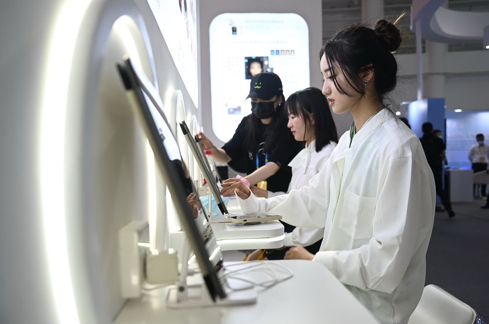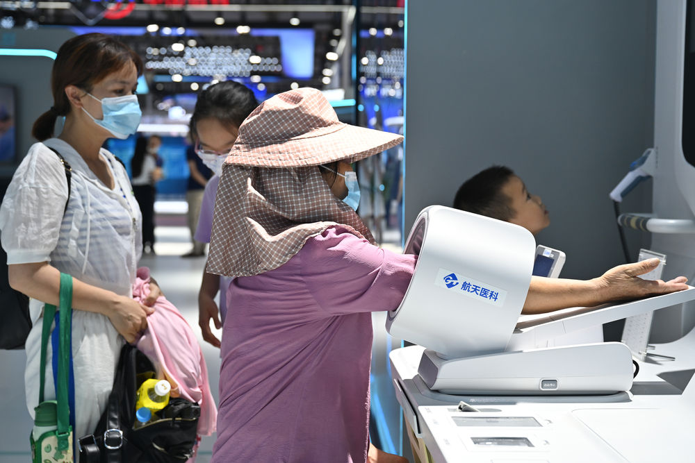 ↑7月22日,观众在第五届数字中国建设成果展览会上体验智慧医疗项目。新华社记者 周义 摄