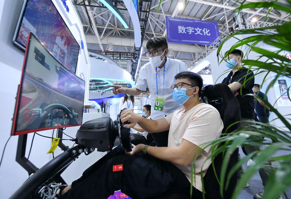 ↑7月22日,观众在第五届数字中国建设成果展览会上体验模拟赛车。新华社记者 林善传 摄