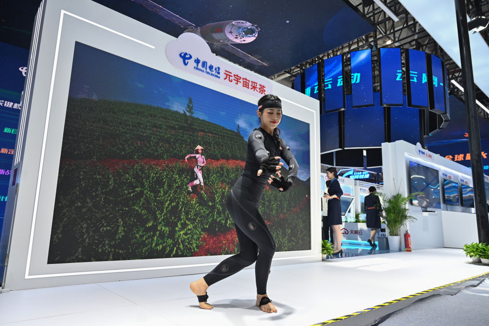 ↑7月22日,工作人员在第五届数字中国建设成果展览会上展示“元宇宙采茶”项目。新华社记者 周义 摄
