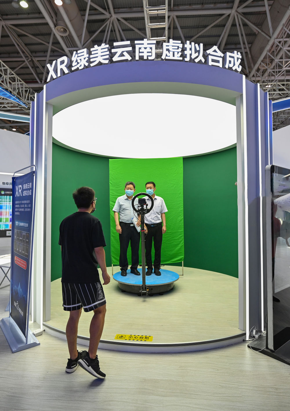 ↑7月22日,观众在第五届数字中国建设成果展览会上体验“XR绿美云南 虚拟合成”项目。新华社记者 周义 摄