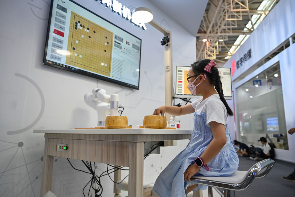 ↑7月22日,小朋友在第五届数字中国建设成果展览会上和AI机器人下棋。新华社记者 周义 摄