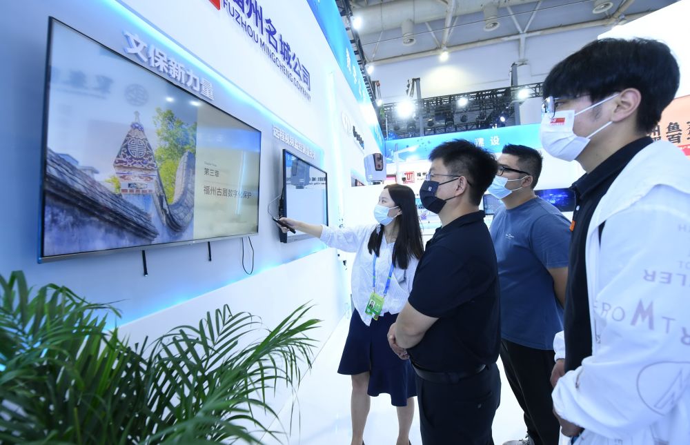 ↑7月22日,工作人员在为参观者讲述福州三坊七巷智慧街区及古厝的数字化保护建设成果。新华社记者 林善传 摄