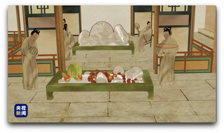 因此,古人想出了各种消暑妙招,比如吃冰。冬天凿冰,将冰块搬进地窖储藏,夏天取出,做成冰饮或直接放在家中,用于降温。杨万里《咏酥》诗中写道:“似腻还成爽,才凝又欲飘。玉来盘底碎,雪到口边销。”描述的就是冰品美食“酥山”。