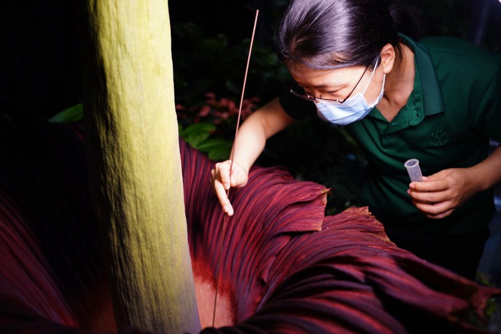 图为科研人员收集第二株巨魔芋的花粉。(受访者供图)