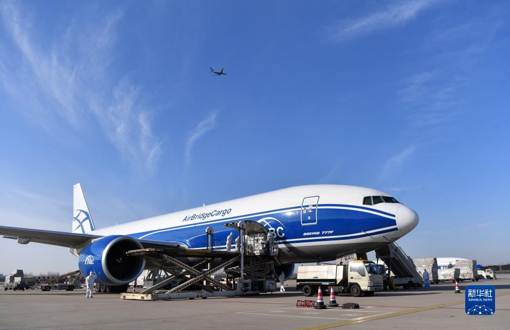郑州新郑国际机场工作人员在为一架俄罗斯空桥货运航空公司货机装货(2021年12月30日)。新华社记者 李嘉南 摄