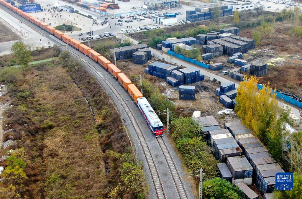 中国郑州至芬兰赫尔辛基的中欧班列驶出中国铁路郑州局集团有限公司圃田车站(2020年11月20日,无人机照片)。新华社记者 郝源 摄