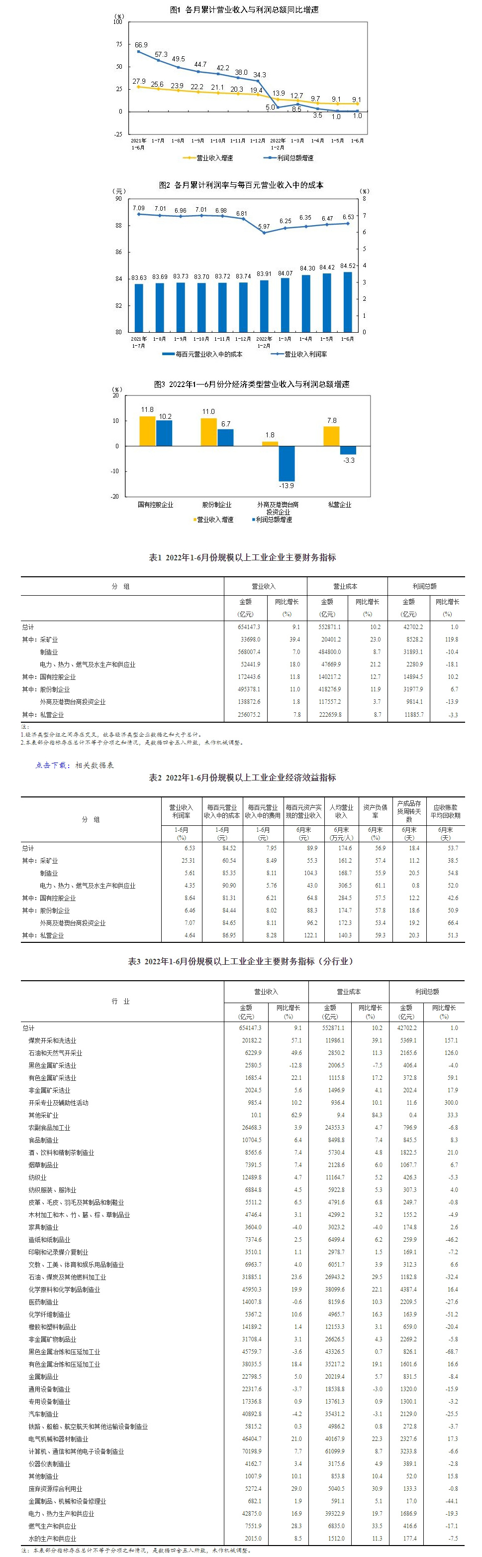1—6月份,规模以上工业企业实现营业收入65.41万亿元,同比增长9.1%;发生营业成本55.29万亿元,增长10.2%;营业收入利润率为6.53%,同比下降0.52个百分点。