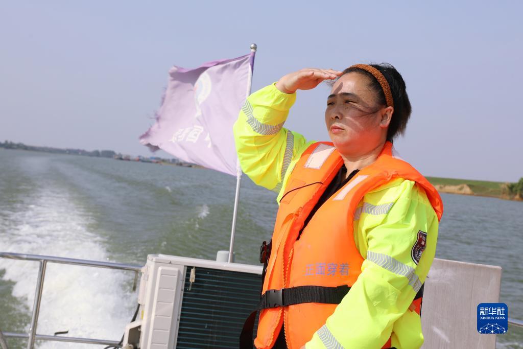 护鱼员朱丽君在湖南省益阳市资江黄湖村河段巡护(2022年7月14日摄)。新华社发(盛拥军摄)