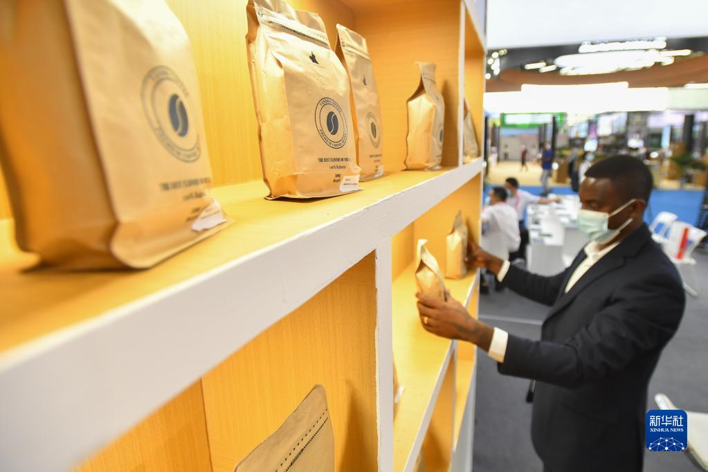 在湖南长沙举行的第二届中国-非洲经贸博览会上,参展商在整理非洲咖啡(2021年9月27日摄)。新华社记者 陈泽国 摄
