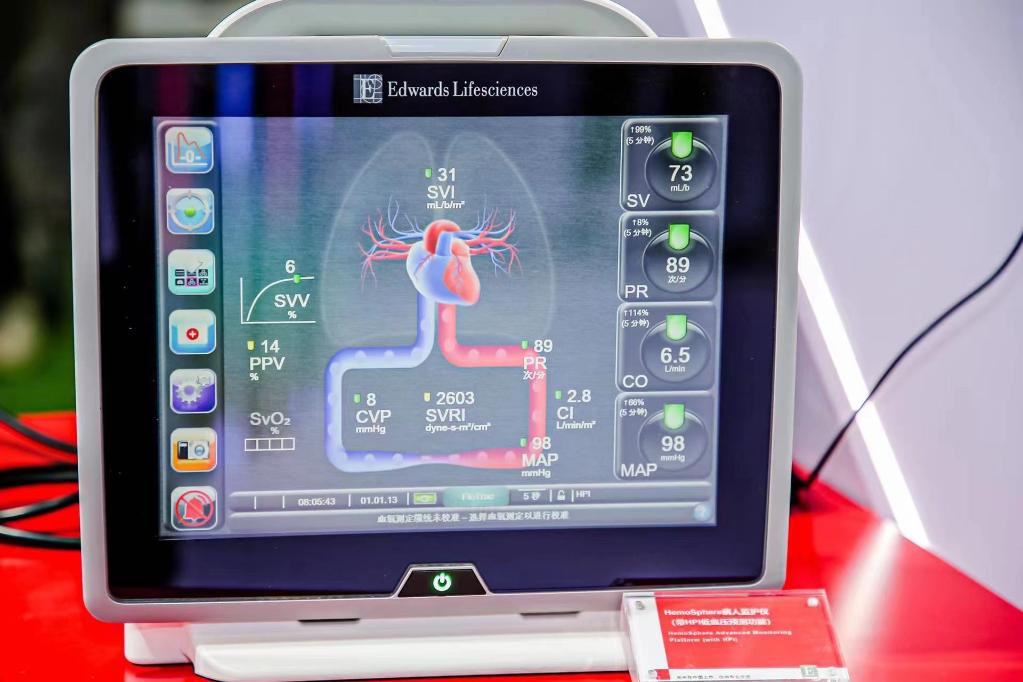 第四届进博会上的爱德华生命科学展台里,全新一代HemoSphere病人监护仪正在展示。(受访对象提供)