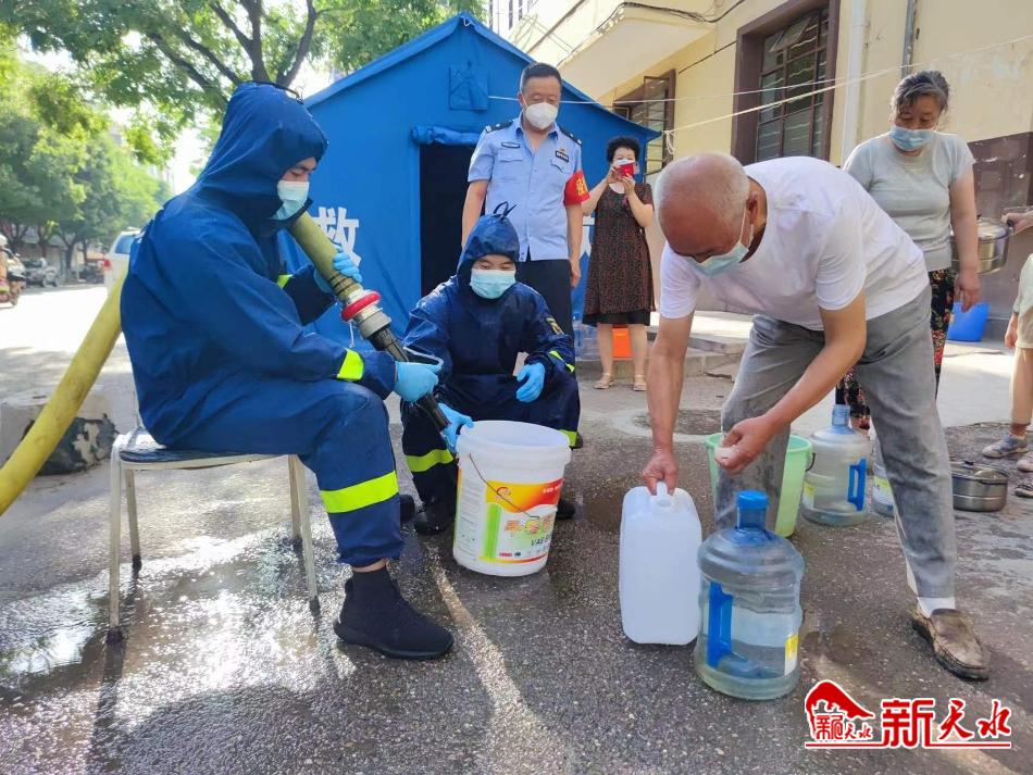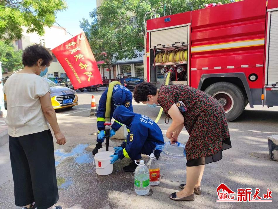新天水讯【记者蔚军平】7月25日,麦积区一工厂家属院因施工致使住宅区临时停水,居民用水告急,麦积区消防救援大队接到求助后,调派车辆和人员在做好个人防护的情况下完成了送水任务。
