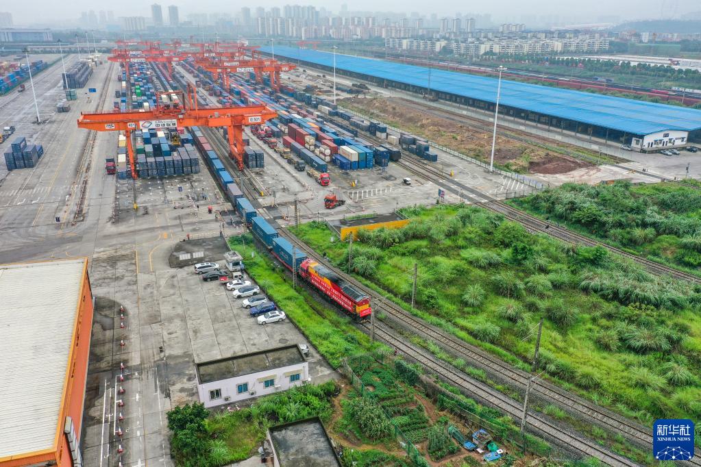 满载着电子产品、机械零件、日用百货等货物的中欧班列(重庆)第10000列列车从重庆团结村中心站驶出(2022年6月23日摄,无人机照片)。新华社记者 黄伟 摄