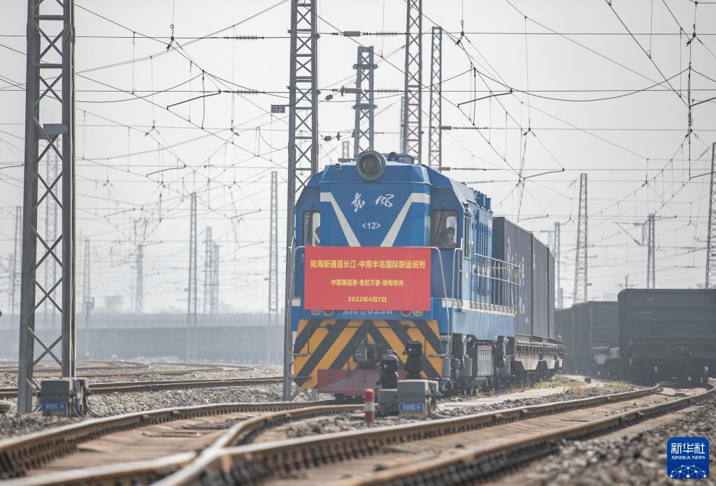 陆海新通道长江-中南半岛国际联运班列(中国果园港-老挝万象-缅甸仰光)从重庆果园港发出(2022年4月7日摄)。新华社记者 黄伟 摄