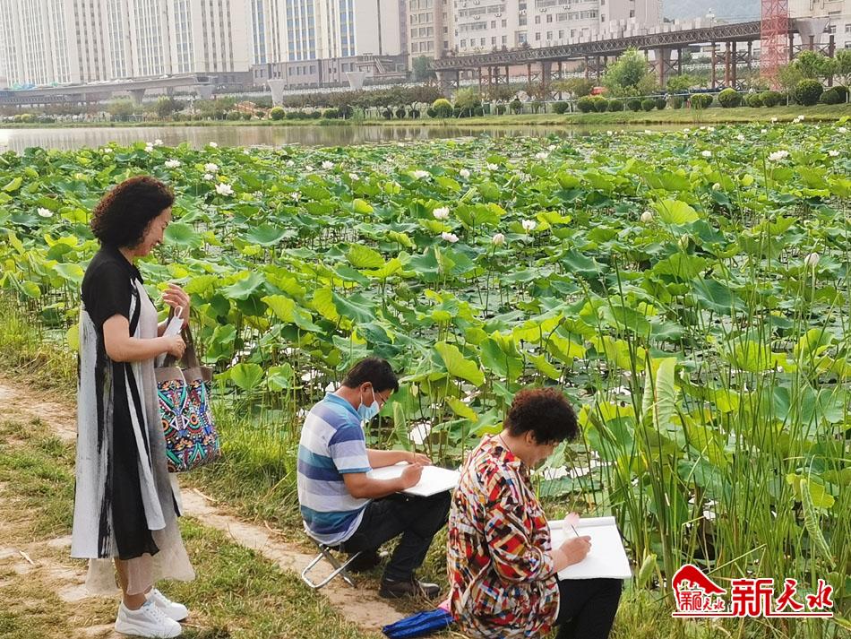 8月1日,几位市民在天水湖畔写生。近日,天水湖荷花渐次开放,崭露头角,吸引了众多市民、游客和摄影爱好者前来赏荷、写生。新天水记者余碧波 摄